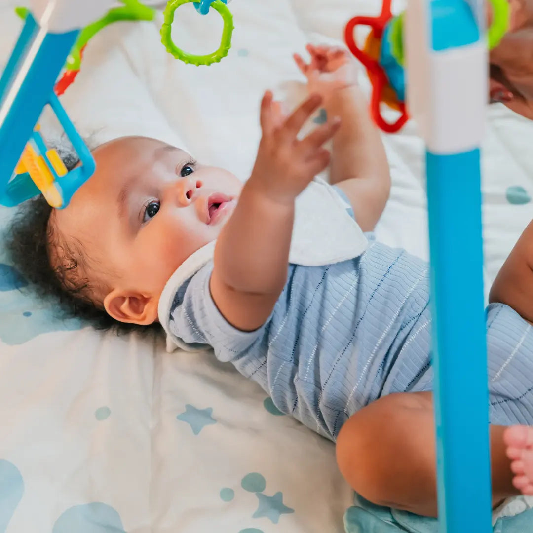 The only baby play gym that can be safely used in a crib, on the floor and more while providing visual, auditory and tactile stimulation.