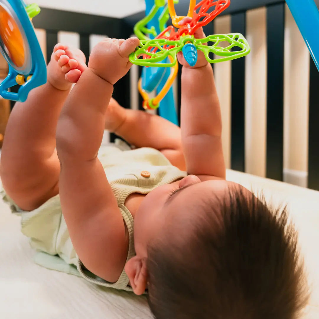 The only baby play gym that can be safely used in a crib, on the floor and more while providing visual, auditory and tactile stimulation.